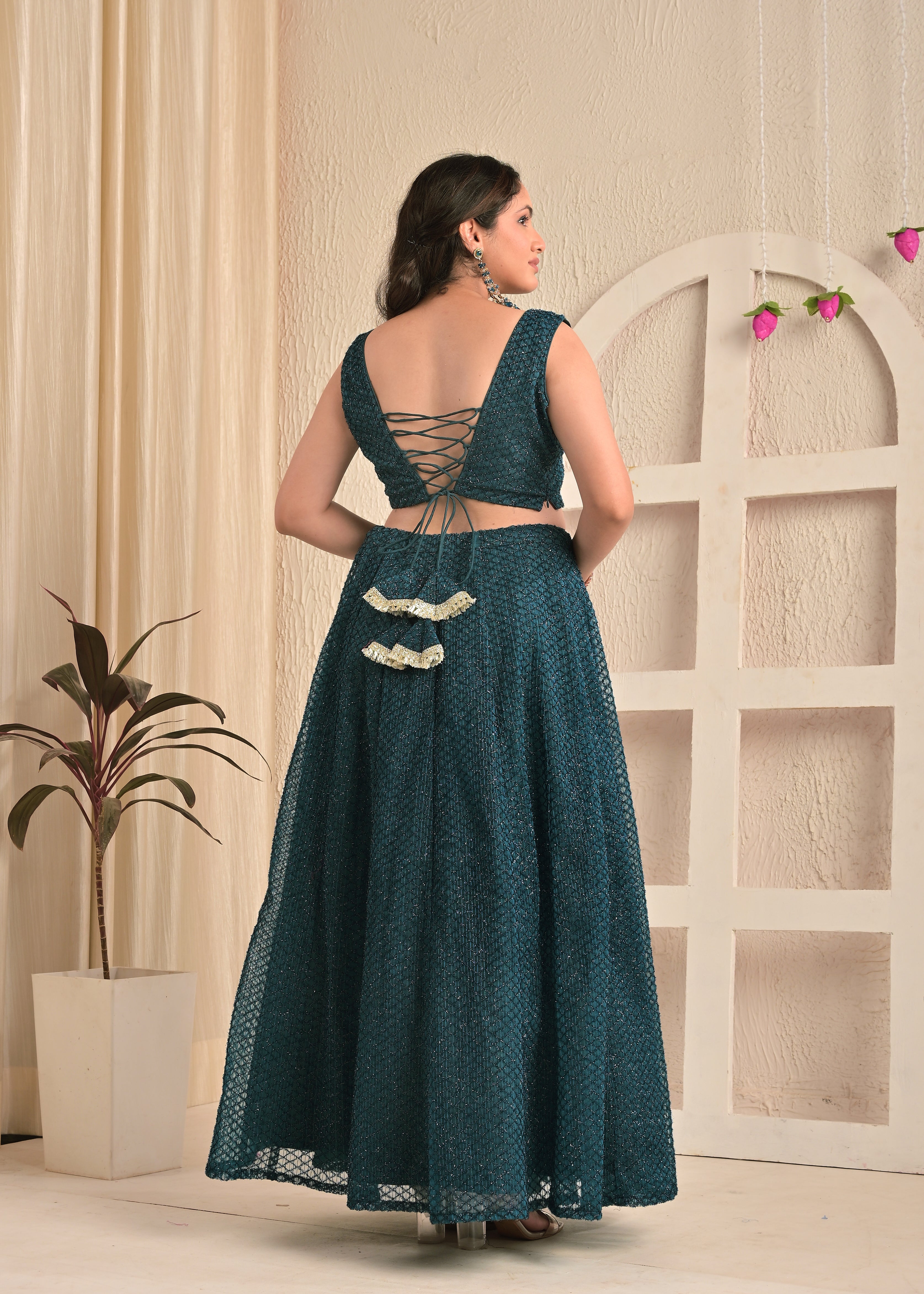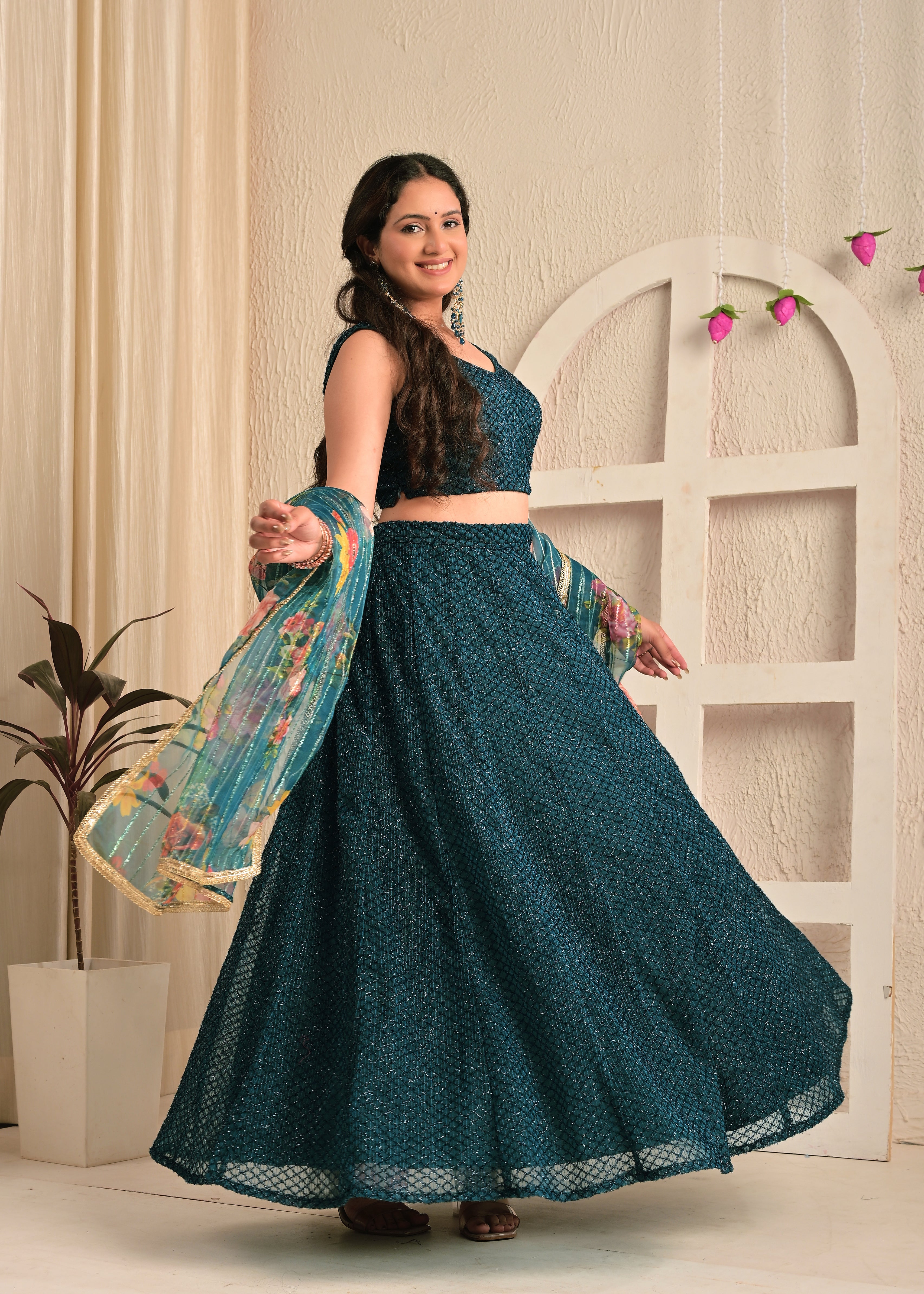 Midnight Teal Net Sequin Embroidered Lehenga Set with Floral Dupatta
