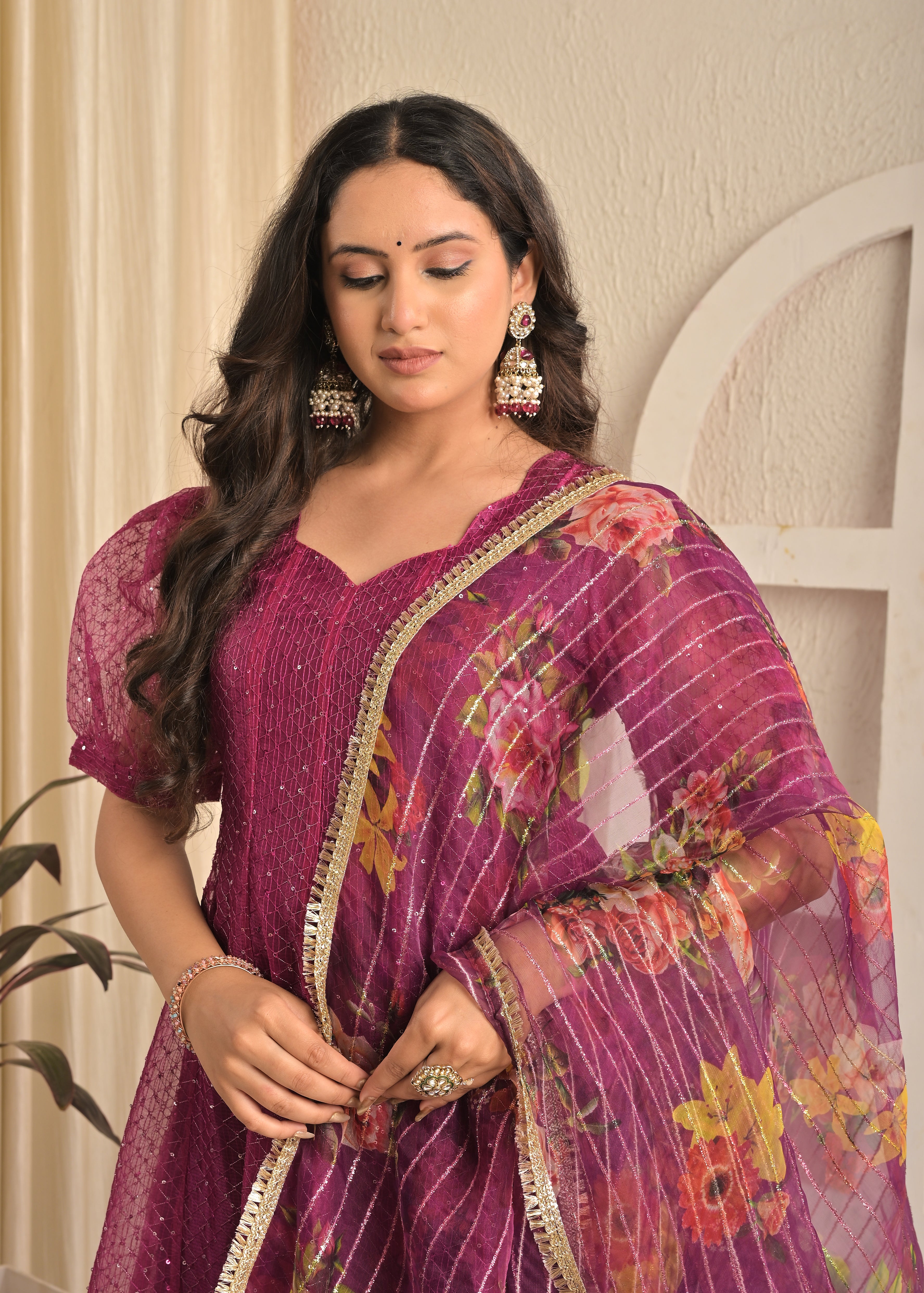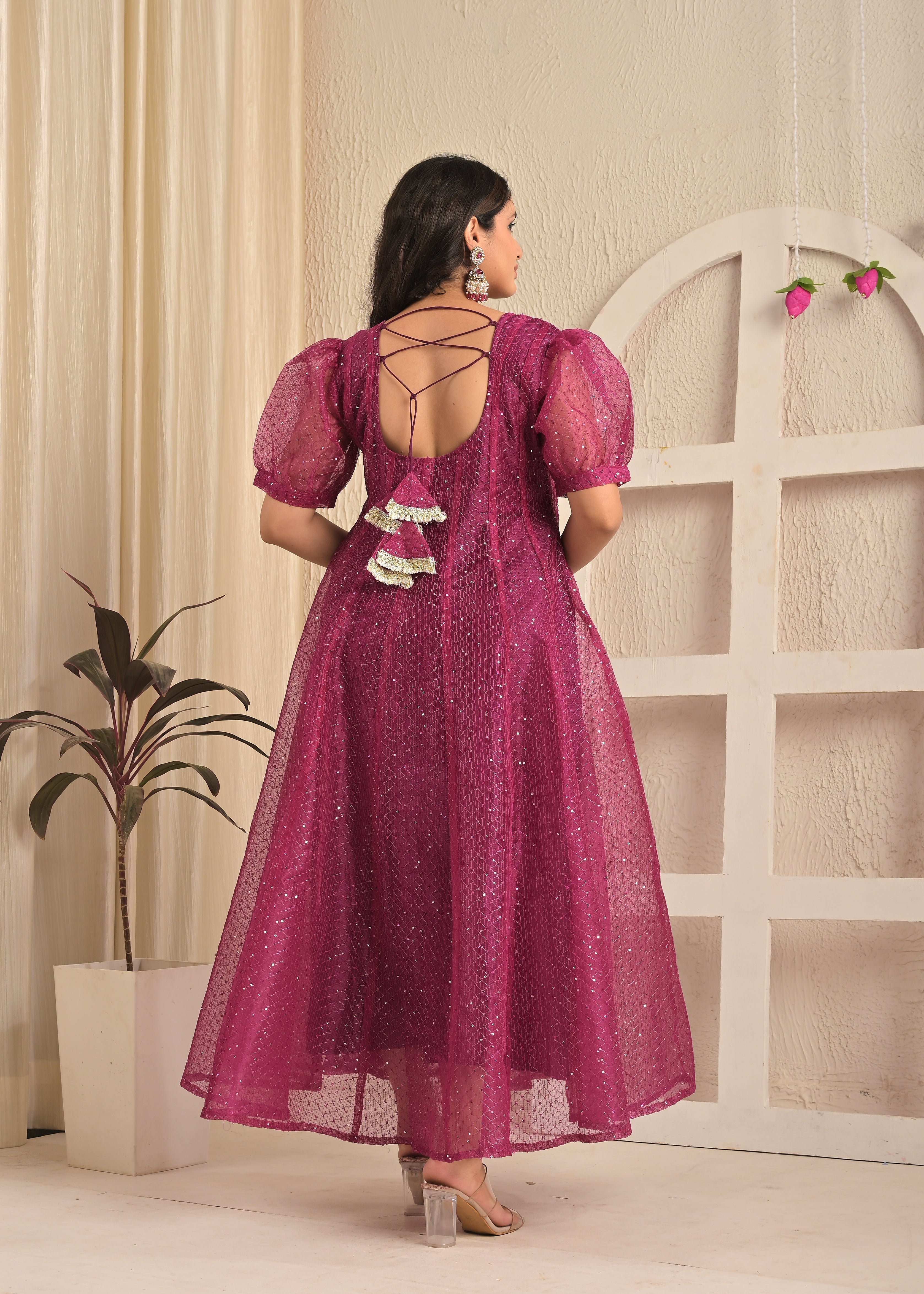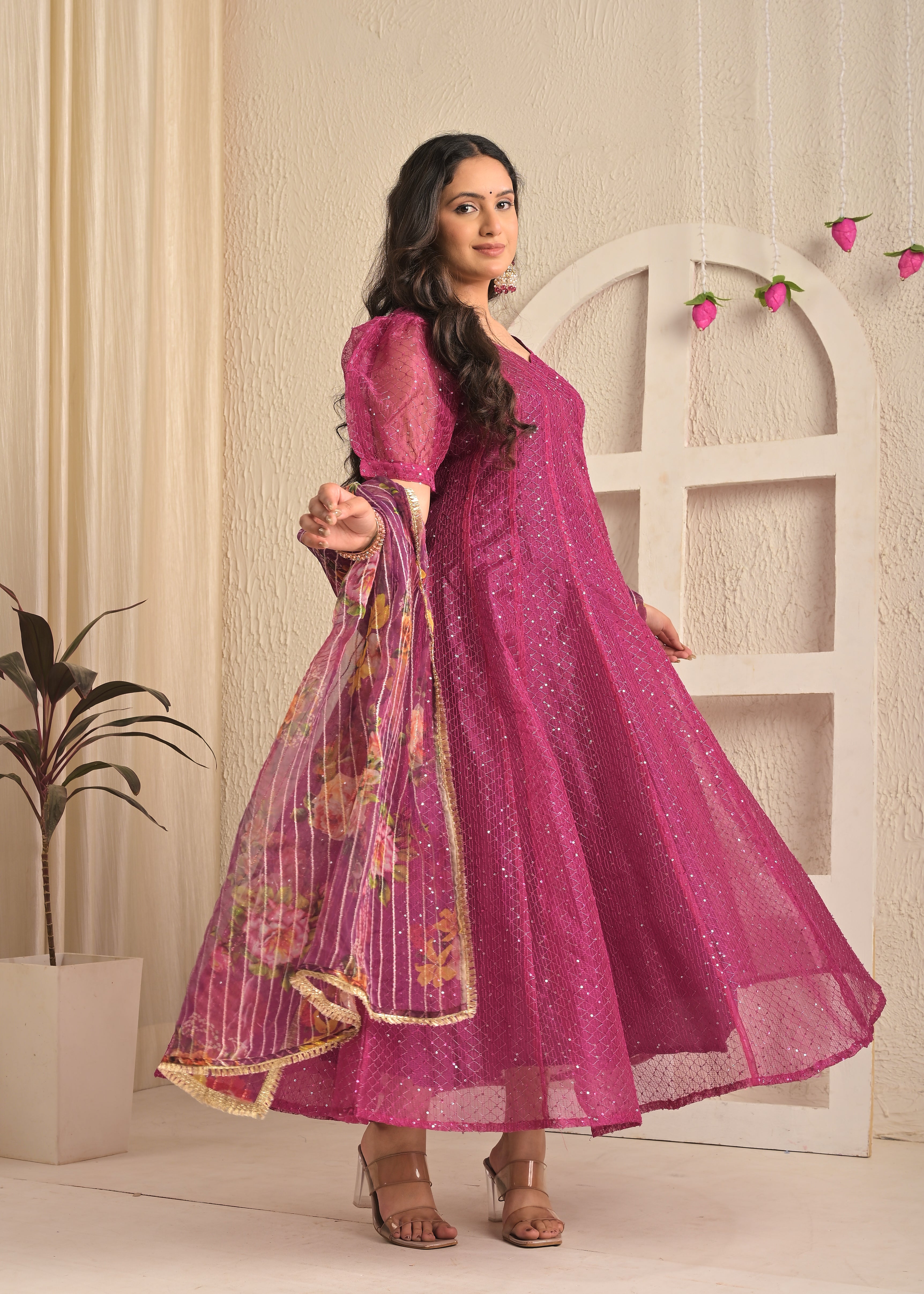 Magenta Shine Organza Sequin Embroidered Gown with Dupatta