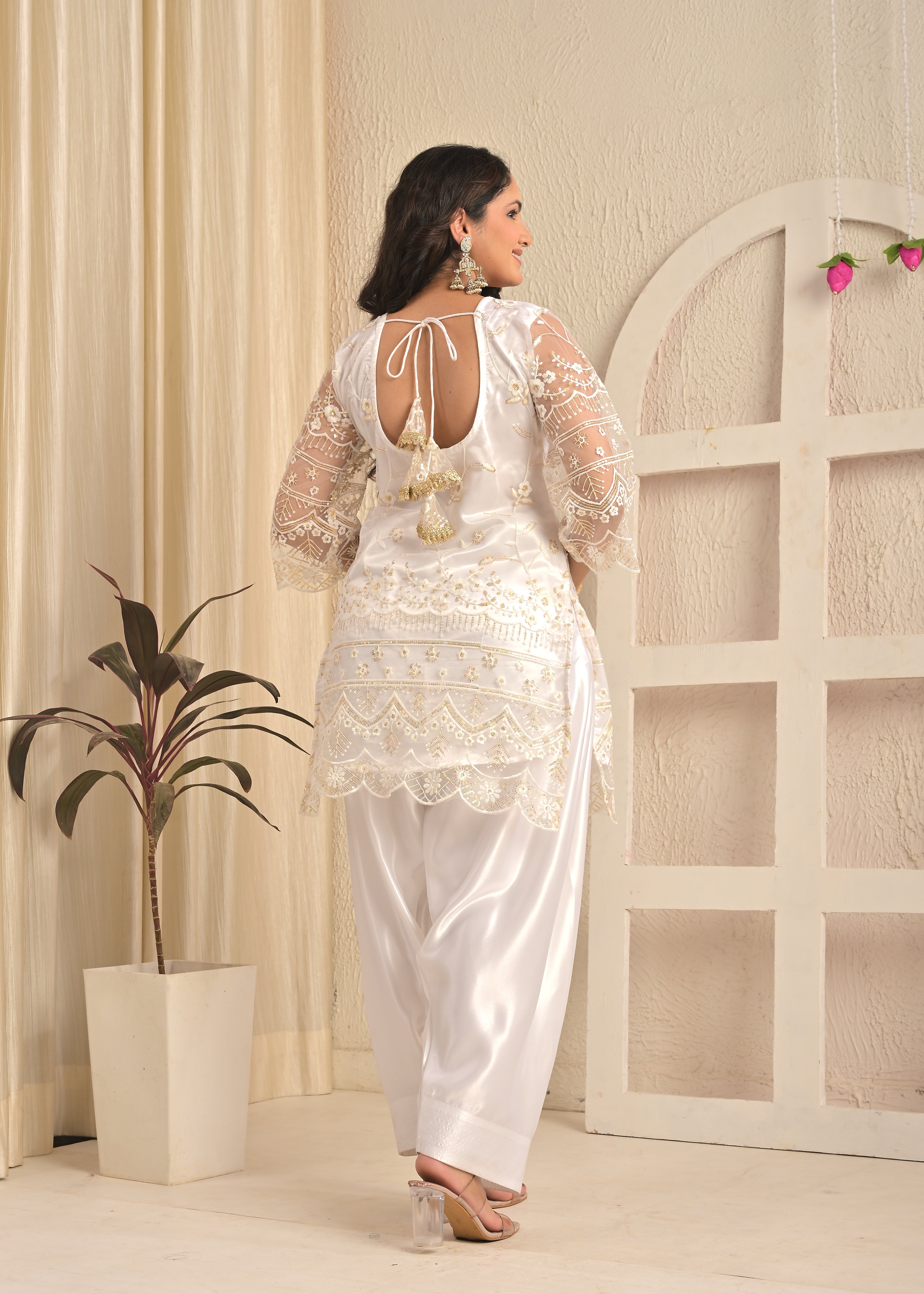Ivory White Embroidered Suit Set with Farsi Salwar and Sheer Dupatta