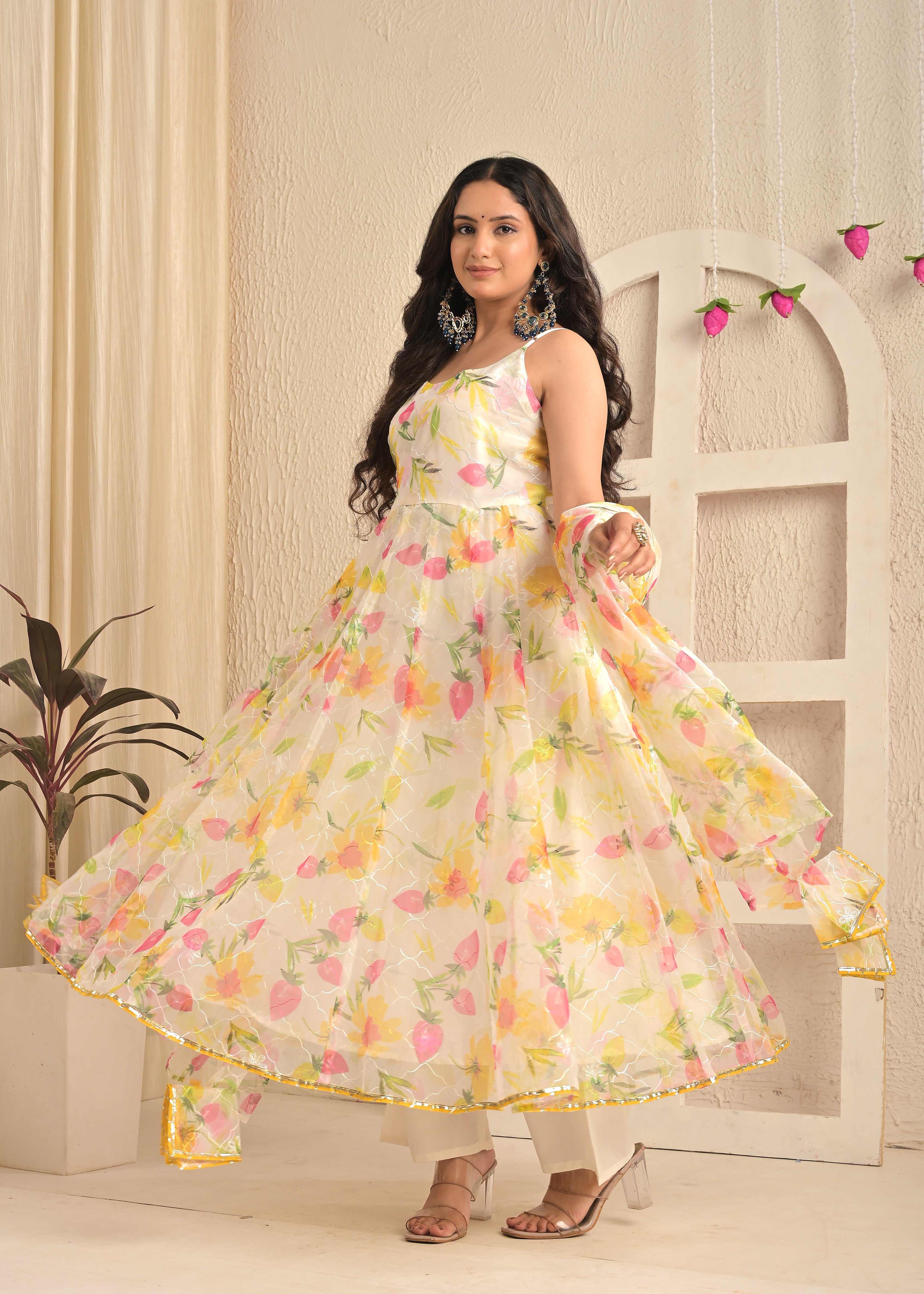 Ivory Bloom Organza Floral Anarkali Set with Dupatta
